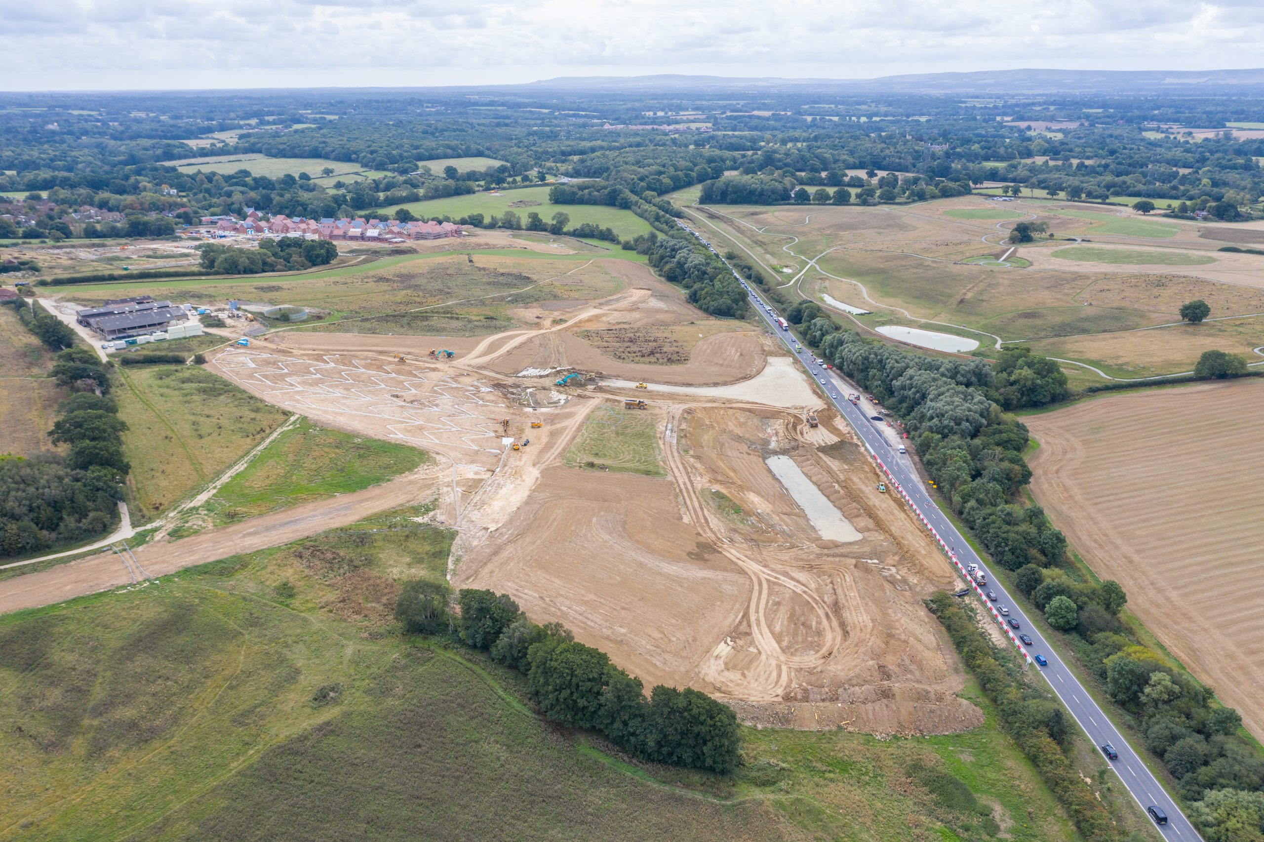 The full scope of works, managed by Total Project Integration, included the construction of a new roundabout directly onto the A22 Uckfield Bypass, between Little Horsted and Copwood roundabouts, the creation of a section of single carriageway that leads to a second on site roundabout and a new vehicle lay-by on the A22 Uckfield Bypass (northbound). Significant earthworks operations were required on this sloping site, along with the diversion of an existing Medium Pressure gas main and the provision of new power supplies for street lighting and illuminated signage and bollards.